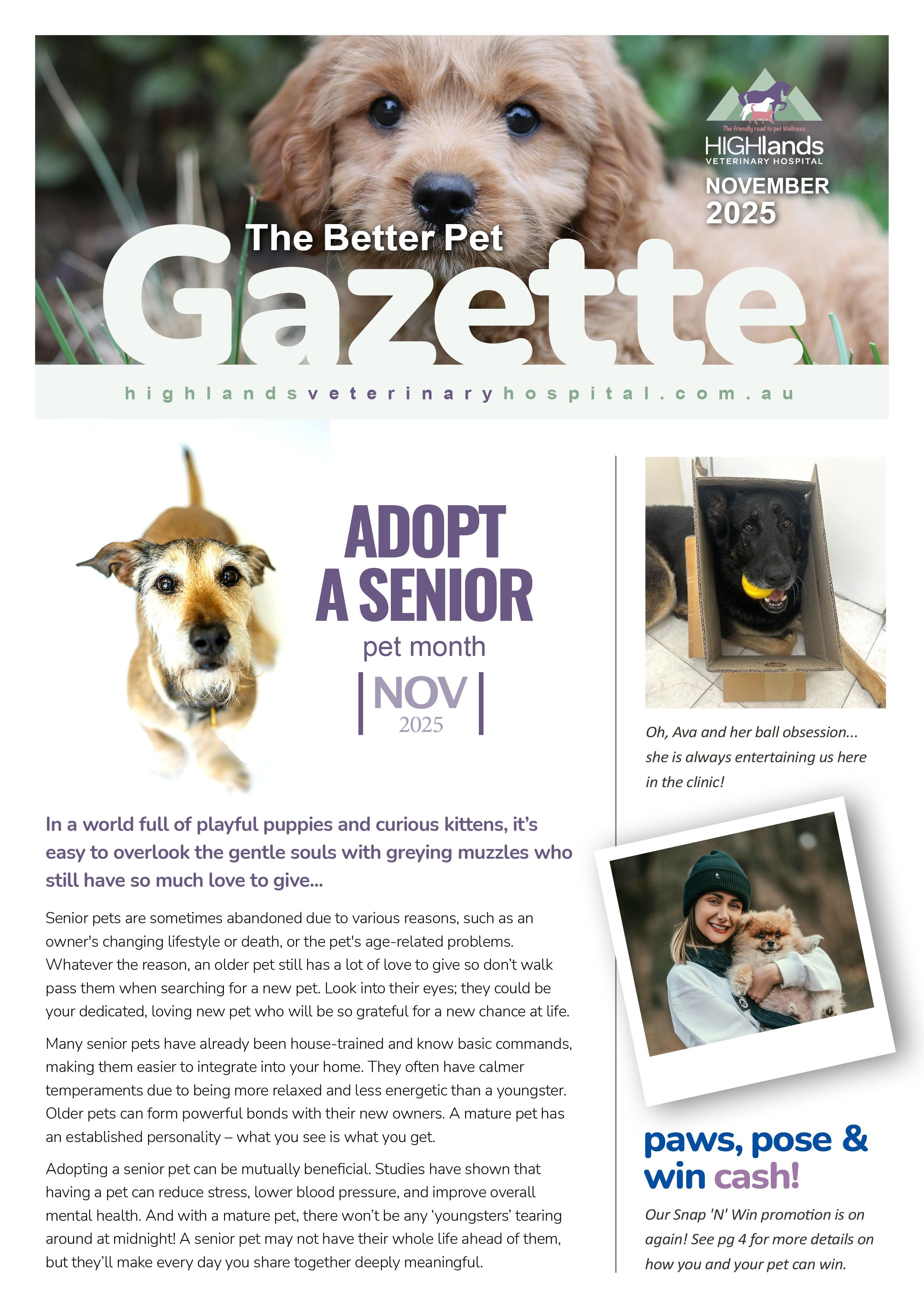 Welcome to our monthly HIGHlands Veterinary Hospital newsletter! Inside this month’s edition you can read all about: Grin and Bear It: Dog tooth care made fun! Dental Offer: Save $100 on your pets dental Forever Friends: - Supporting your pet in their 'golden' years The Journey...